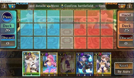 中间是战场,我方为蓝敌方为红,各有3*3九宫格的召唤怪兽格,中间还有一列3格的过渡格,两边各有三项按钮,左边的Pass按钮即跳过该回合,mana会保留至下回合(快捷操作为select键),右边是Hand即为对方手牌数,Deck是双方的卡组里剩余的牌数,Discard是双方的进入墓地的牌数,当墓地里有牌时可以点开查看,下方显示的是我方手牌,初始五张牌,除去第一回合每回合会抽一张牌,每次开始游戏会投硬币,蓝则我方先手红则对方先手。