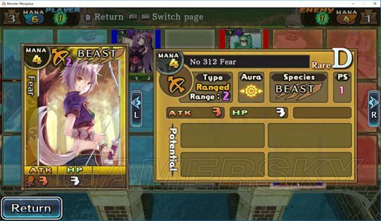 中间当然是我们玩游戏的动力之一美少女立绘,左上角是mana消耗,上方是职业以及种族,职业分为战士(剑标记),射手(弓标记,标记下方的数字为射程),祭司(杖标记),法师(书标记),种族分为龙、类人、兽、鸟、妖精、自然、不死、高等鸟,下方是该卡的战斗能力,ATK攻击力,HP生命值,MP(祭司专有)魔法值,INT(法师专有)智力,边框的颜色分为四种红、蓝、绿、黄应该是代表4个国家的意思,Potential为天赋,对战中按x键可查看怪兽的skill(技能)