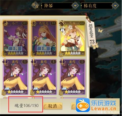 出战队伍是有魂量要求的,超过了就无法上阵。而魂量的总数是随着等级的提升而提升,没有其他增加的方式。小编给萌新门算一下,出战队伍最多只能上阵5人,SSR占用的魂量是16,SR的是12,R的是7。而且上场的妖灵师需要带合适的逸事札(就是加Buff的装备),这个装备也是需要占用魂量的,一张SSR的逸事札魂量是12,SR逸事札的魂量是7,R逸事札的魂量是3。现在小编39级,魂量130。