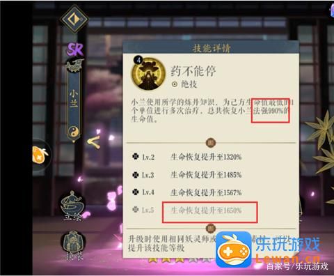 主要技能:绝技【药不能停】小兰使用所学的炼丹知识,为己方生命值最低的1个单位进行多次治疗,总共恢复小兰法强990%的生命值。被动一【回春术】小兰对己方生命值最少的3个单位进行多次治疗,总共恢复小兰自身法强49%的生命值。被动二【炼丹天赋】回春术的效果会对血量低于30%的己方单位效果额外增强50%。被动三【爱的祝福】药不能停会同时提高被治疗的己方单位物理护甲9%。
