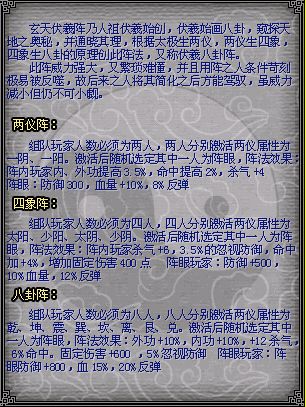 阵法激活:阵内玩家杀气+6,3.5%的忽视防御,命中加+4%,增加固定伤害400点阵眼:防御+500,10%血量,12%反弹