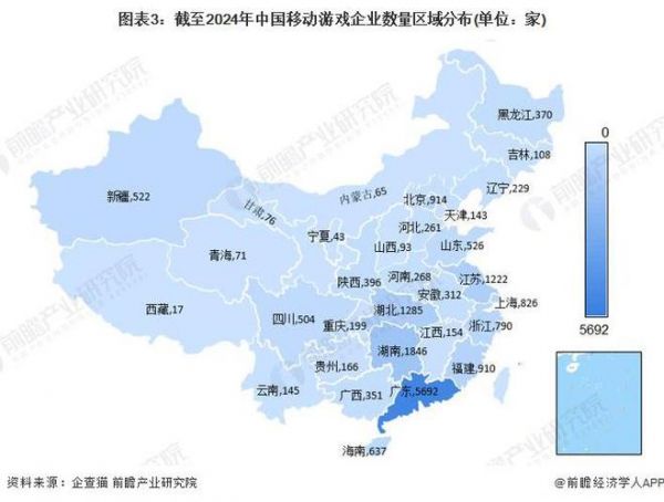 根据中国企业数据库企查猫,目前中国移动游戏企业主要分布在广东省。截至2024年2月,广东共有移动游戏企业数5692家,占比29.74%;其次是湖南,有1846家,占比9.64%;湖北排名第三,有1285家,占比6.71%。广东省是我国移动游戏研发与运营大省,产业集群及产业配套衔接完整,拥有腾讯游戏、凯撒文化、多益网络、盛迅达、大晟文化等具备国际知名度的大型移动游戏公司。
