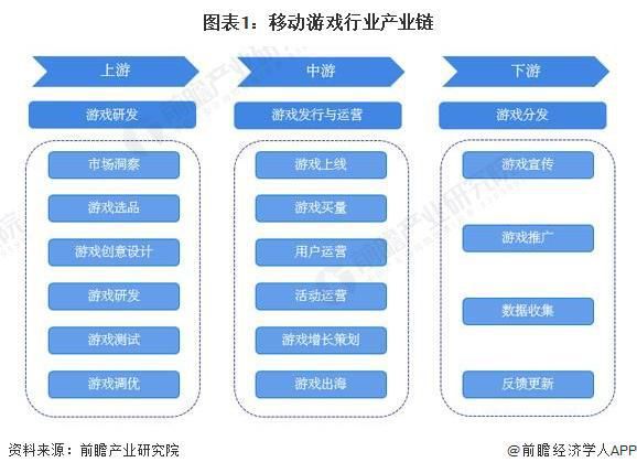 中国移动游戏的产业链上游为游戏研发,中游为游戏发行与运营,下游为游戏分发。其中,游戏研发环节包括市场洞察、游戏选品、游戏创意设计、游戏研发、游戏测试和游戏调优等步骤,游戏发行与运营则包括游戏上线、游戏买量、用户运营、活动运营、游戏增长策划、游戏出海等过程,游戏分发则是在不同平台进行推广宣传、数据收集、反馈更新的过程。