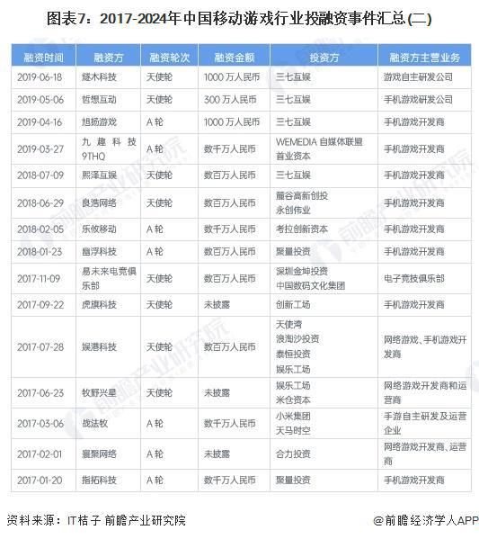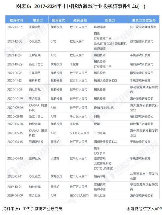 根据移动游戏行业公开披露的融资事件来看,2017-2024年行业直接融资资金主要来源于企业风投资本(CVC),占比超过50%,例如腾讯、三七互娱、途游游戏、快手、哔哩哔哩、福州天盟数码IGG、趣加等;其次是传统私募资本及风险资本(PE/VC),例如聚量投资、红杉资本中国、IDG资本等。
