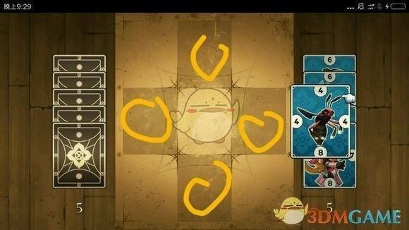 首先看卡牌,每张卡牌上下左右四个方向都写了数值,分别对应了卡牌四个方向的战斗力。比如说这张牌,代表着他对上方的卡片战斗力是1,左右两边都是5,对下方是4