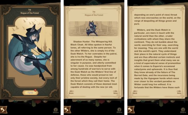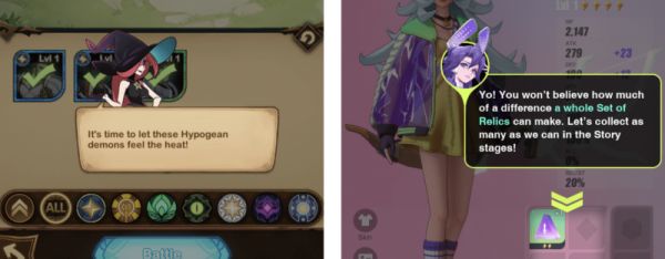《剑与远征》依然是一个很好的例子。当玩家每解锁一名英雄的时候,都可以阅读一小段这些英雄的背景故事。通过阅读这些故事,玩家可以获得钻石奖励,并通过这些奖励去解锁更多英雄。