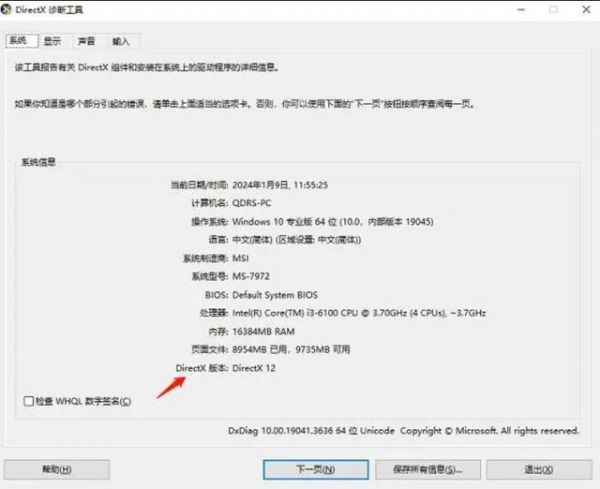 2、在“系统”选项卡中检查DirectX的版本,若版本低于游戏所需版本,则需进行升级。