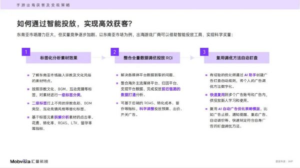 《白皮书》指出,出海游戏厂商可以借助智能投放工具,实现科学买量。以东南亚市场为例,厂商可以按照宗教文化、BGM、互动竞猜等标签,对素材打上分类,并基于此拆解素材的点击率、花费、转化率等指标,以判断哪些素材更受本土玩家欢迎。