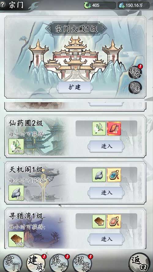 建筑算是宗门的生产车间,主要由灵石塔、神木殿、仙药圃等构成,其玩法类似模拟家园,只需要我们定时的收集物资和升级建筑即可,获取的材料反哺主线的养成,比如仙药圃产出的玄灵根炼药后可以提高仙众实力,弟子板块主要招募宗门弟子,是与仙众区分开来的,招募获取的弟子主要作用建筑模块,弟子的等级越高,建筑模块生产能力越大。物资除了常规产出还可以靠掠夺获取,只不过每次只有五次机会。