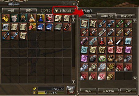 4. 打开背包(快捷键I),点击「背包商店」按钮,可随时购买返回城镇的返回卷轴,提高伤害里的灵魂弹和魔灵弹等,恢复药水等