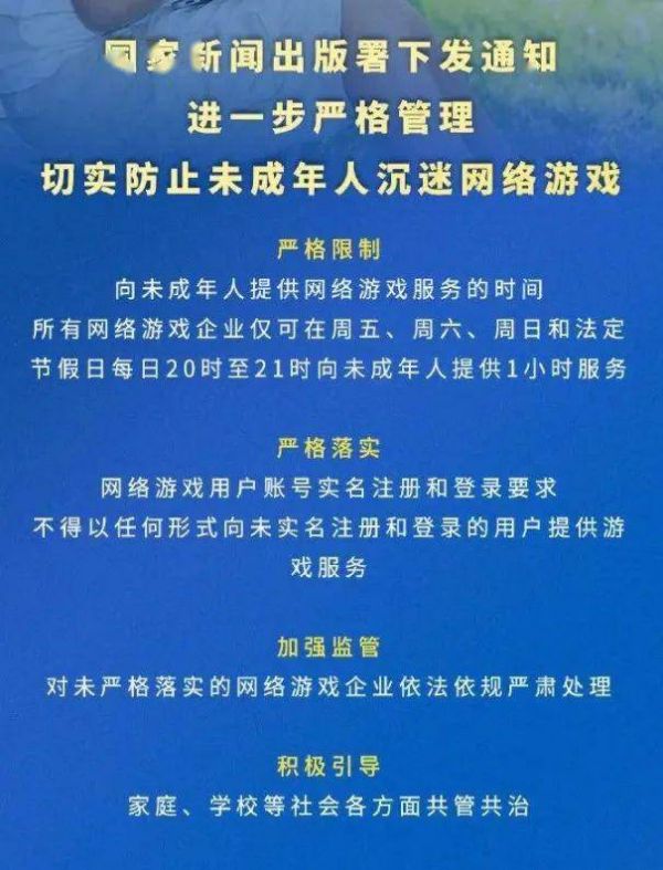 在 8 月月末,国内游戏市场监管政策总算靴子落地。国家新闻出版署下发了《关于进一步严格管理切实防止未成年人沉迷网络游戏的通知》(以下简称《通知》),要求所有网络游戏企业仅可在周五、周六、周日和法定节假日每日 20 时至 21 时未成年人提供 1 小时服务,其他时间均不得以任何形式向未成年人提供网络游戏服务;严格落实网络游戏用户账号实名注册和登录要求,不得以任何形式向未实名注册和登录的用户提供游戏服务。