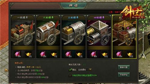 押镖是获取神石的主要途径,每次押镖都会给予玩家大量神石碎片和元宝。目前在游戏中有五种等级的镖车,奖励依次递增,押送之前需要先刷新一下,刷新需要消耗押镖令牌/10钻石,如果你担心自己的镖车会被劫,可以购买保险。购买保险押运成功获得120%奖励,购买保险车被劫仍可获得100%奖励。