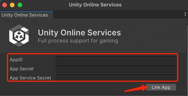 注意:该步骤要求当前环境已安装 git。注意:UOS Launcher 兼容的最低 Unity 版本为 2021.3 (LTS)。1.2.在 UOS Launcher 中连接 UOS APP安装成功后通过 Unity Editor 菜单栏中「UOS -> Open Launcher」 打开管理面板。在 UOS 面板中填写 AppID/AppSecret/AppServiceSecret,并点击「Link App」 与 UOS APP 关联。