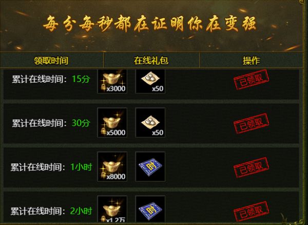 累计在线时间2小时:12000元宝、离线挂机卡