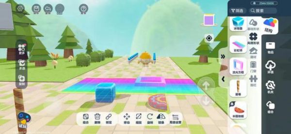 《蛋仔派对》官网的“工坊乐园”模块对于这一APP的功能有着详细的教程,简单地说,玩家可以利用编辑器设计各种指令、形状、机关,通过连续组合创造出各种各样的物体、事件、规则、环境、运动轨迹等等,再将这些创造出的元素进行一定规律的组合排序,一张《蛋仔派对》的游戏地图就创造完成了。在编辑器中,包括12种基础形状和142个机关在内,共计千余种花样组件的巨大组件库,给使用者足够大的想象空间。我们在玩家创造的地图中可以欣赏壮丽山河、宁静乡村,甚至还可以乘坐摩天轮。