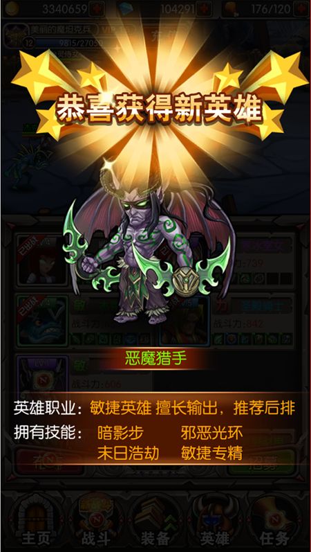 恶魔猎手是VIP礼包内的英雄,如果你人品好的话可以在魂石招募中获取到他。属于一个强力的输出英雄。 暗影步属于一个强大的AOE伤害,可以比较快速的清理场上小怪。 邪恶光环属于一个辅助技能,可以提升队伍的闪避能力,可以提神队伍的生存能力。 末日浩劫是一个强大的技能,可以快速击杀后排的敌人,更加轻松的解决战斗。 ...