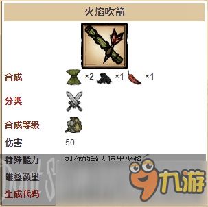 接下来小编为大家带来饥荒手机版火焰吹箭资料详解,饥荒手机版火焰吹箭怎么做,一起来看看饥荒手机版攻略吧。 火焰吹箭 火焰吹箭(Fire Dart) ,是六格的远距离武器武器。使用时会造成目标生物着火,每支火吹箭只能用一次,可堆叠20支。 如果是会掉落食物的生物,被火吹箭击杀时会掉落烤熟的食物。 (例: 兔子会掉落烤熟的小肉块) 击中[蜘蛛巢]]时,蜘蛛巢会着火,且不会掉落资源,里面的...
