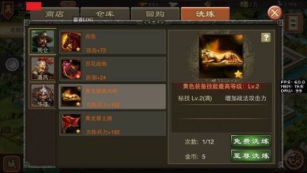 5.装备属性等级。黄色装备以上有技能属性,装备的技能在“装备”->“洗练”中进行洗练。黄色装备有一个装备技能,最高等级2级;红色装备有两个装备技能,最高等级3级;紫色装备有三个装备技能,最高等级5级。