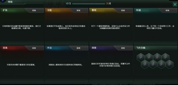 是游戏中一种加点系统,开局前为自己的种族选择加点,在游戏开始后不可主动更改。理念分为10种,玩家和AI可以自主选择。分为:和平主义、军国主义、平权主义、威权主义、唯心主义(唯灵主义)、唯物主义(科技主义)、亲外主义、排外主义、蜂巢思维(格式塔)、机械意识(格式塔)。不同的理念倾向会为种族提供不同的加成,例如和平主义无法主动发动侵略战争,排外主义不能给其他种族平等的公民权等。 [3-4]