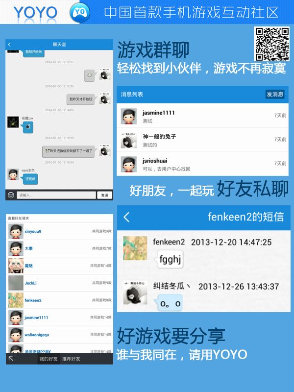2014年伊始,一款手游玩家必备的神器级应用——“YOYO”正式来袭。作为由游久时代出品的国内首款手机游戏社区软件,YOYO也是第一个将攻略论坛、社交聊天与发卡礼包合而为一的综合性辅助应用。好游戏,要分享!千万战友在线分享,你还在等什么?