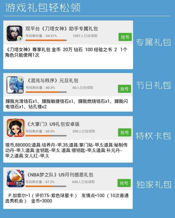YOYO的礼包推送功能会在第一时间内为玩家提供覆盖全手游的所有礼包,依托于游久网强大的发卡平台以及和广大游戏厂商建立的良好关系,根据用户的游戏需求进行精准推送,让玩家在游戏中享尽各种福利
