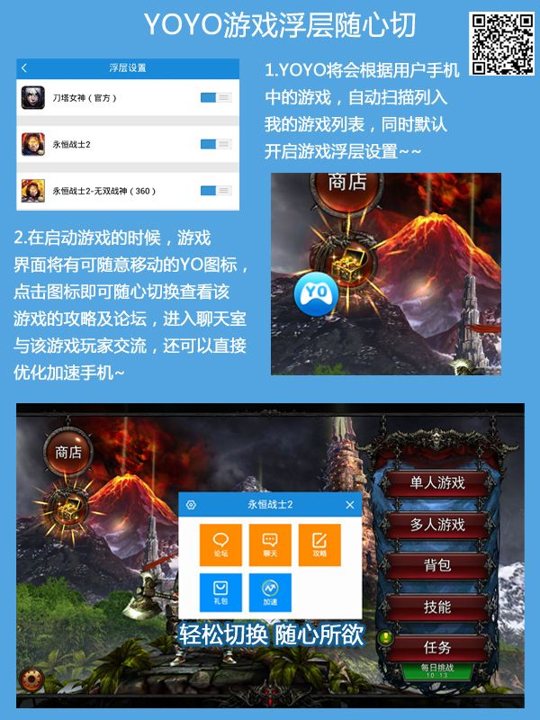 无论何种游戏类型,无论遇到任何技巧问题或是数据查询,轻点浮层上的按钮,即可一键进入YOYO游戏攻略专区或玩家论坛,高手秘籍与通关攻略一览无余,让你分分钟化身高玩,特别是可以在妹子面前秀出你的高超技巧,俘获她芳心!而玩家在查询攻略后轻松点击即可将YOYO界面隐藏,方便实用又不影响游戏体验。