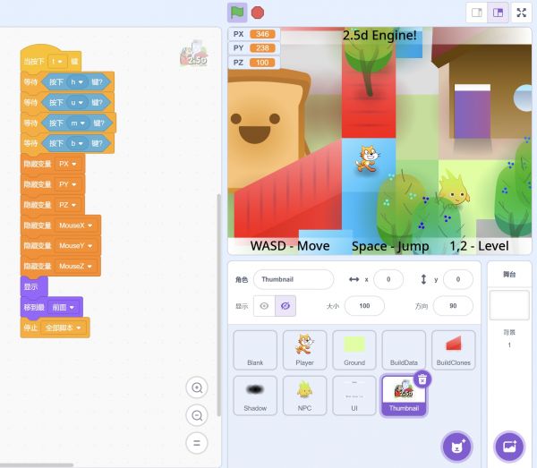 《2.5D 游戏引擎 (2.5D Engine)》是一款支持在Scratch中创建2.5D游戏的引擎,为用户提供全新的游戏开发体验。你可以用它制作具有深度感的游戏场景,搭建平台式RPG或其他风格的作品。代码内部附有详细注释,帮助理解关键实现,期待大家用这个引擎创作出更多出色的作品!
