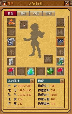 游戏中的基础装备包括武器、防具和饰品。武器包括剑、刀、法器、暗器,各职业武器不相同,不可混用。防具包括头部防具、上身防具、下身防具、足部防具,饰品包括项链、戒指、法宝。