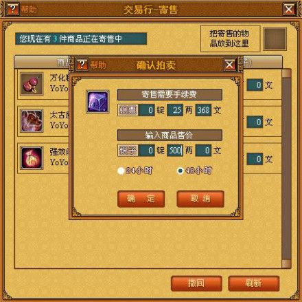 把需要寄售的道具拖到右上角的空框内,会弹出输入商品售价的提示,玩家在银子的位置输入自己想要卖出的价格,并选择寄售时间为24小时或48小时,点击确定即完成寄售。寄售需要缴纳一定的银票作为手续费,系统会根据玩家输入的售出价格自动换算出手续费,确定寄售后扣除银票数量。