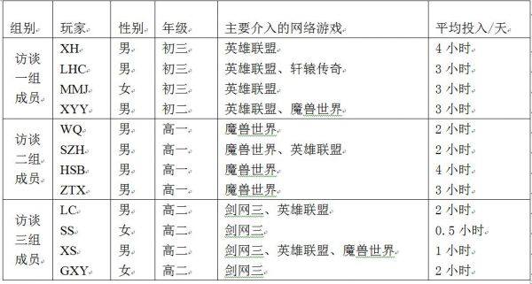 本研究讨论的角色扮演类网络游戏均为以个人计算器为终端的网络游戏,并主要以魔兽世界、剑侠情缘网络版三(剑网三)、英雄联盟这三个网络游戏的青少年玩家为研究的对象。本研究选取的研究对象是主要参与以上三个网络游戏的初、高中青少年(13—19周岁)玩家。不同访谈组的研究对象参与的网络游戏存在重叠,且部分研究对象是参与过以上三个游戏中的两个或两个以上的玩家。