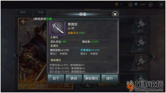 装备属性会对武将和士兵有大幅度加成,装备属性只对属性词条的兵种进行加成。如下图,荆轲是骑兵,所以此装备给荆轲佩戴,可以大幅度提升荆轲部队的攻击力。