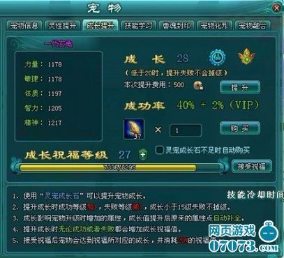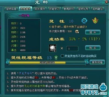 宠物的强大要看两个方面,一个是成长、一个是灵性。宠物成长关乎宠物的力量、敏捷、体质、精神、智力的发展,宠物灵性关乎物攻或是法功、物理防御、法术防御、命中、闪避、暴击的成长。通过灵宠灵性丹跟灵宠成长石可以对着两项指标进行提升,提升过程中可能出现掉级现象,VIP玩家有成功率的加成。