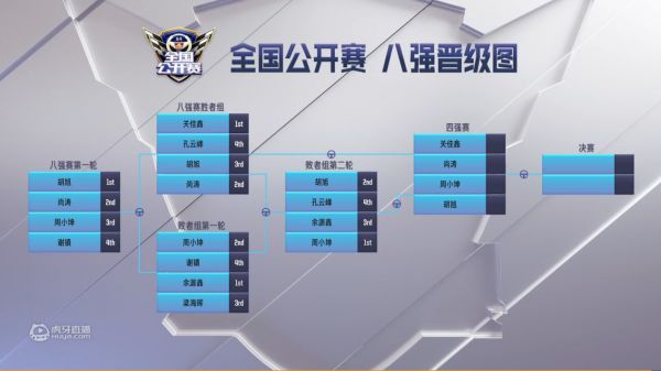 经过半决赛的角逐,关佳鑫和尚涛从胜者组中取得四强赛的门票,周小坤于胡旭经过败者组第一轮和败者组第二轮的竞争也如愿获得剩余两张决赛门票。