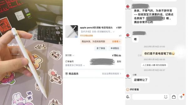 小星表示尽管自己的使用要求不高,但产品的实际体验完全没有店家描述得全面,“笔在外形上跟Apple Pencil很像,但是在写字时没有按压感,蓝牙有时还会断,而且充电头的笔帽部分很容易脱落。我有段时间没有使用,再拿出来的时候发现笔充不上电了。之后我去找客服才发现店铺已经转让,没有任何售后途径。”