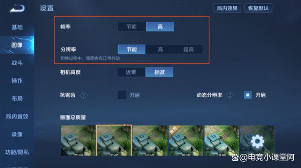 分辨率对于高手玩家来说,这个设置只需要节能即可,因为这个设置是可以提高英雄特效的效果设置,对于操作来说,并没有很大的帮助,毕竟我们需要的是上分,所以节能是最好的,如果开最高的话,打团是会卡顿的。