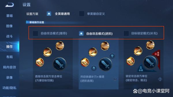 这个设置,就需要了解一下了,因为有三个不同的攻击设置,适合的英雄也都是不一样的,第一个设置,是适合刺客跟近战英雄的,比如战士,刺客就是适合用第一个设置,而射手,就是第二个设置,一定要打开推塔的设置,射手不打开推塔设置,推塔的速度是会非常慢的。
