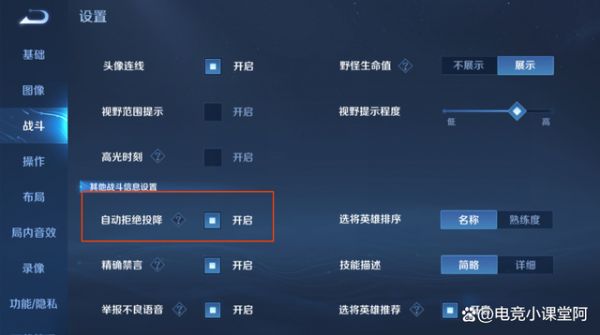 这个,必须打开,这个设置,很多高手跟代练都是打开的,因为对于高手玩家来说,比赛是很重要的,一把游戏,不管输赢,都要打好,这才是高手玩家的修养,点投降,是最没用的,就算这一把稳输,我们也要打完。
