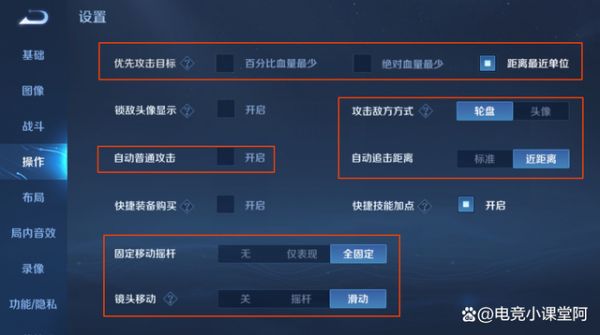 攻击方式一般是轮盘,很少有英雄需要用头像的攻击方式,张良的话就是头像攻击,比如大招要锁人的时候,就需要精准的不空技能,也就是打开头像攻击就能精准的锁住目标,自动追击距离推荐使用近距离,这个设置打开了,我们在空A的时候就不会乱跑,固定摇杆选择全固定,镜头移动选择滑动。
