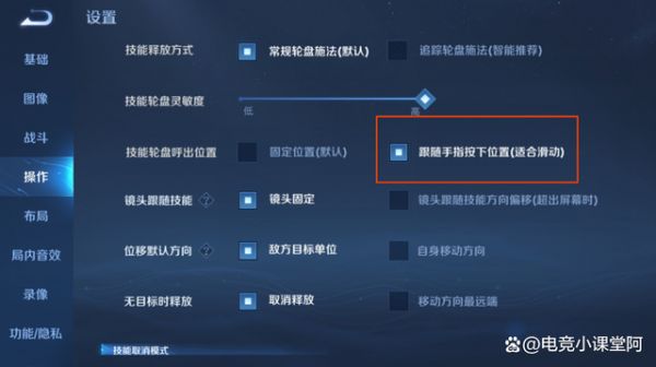 这第六个设置,也是比较重要的,在游戏中,我们使用技能的速度,就是跟这个设置有关系,如果没有打开这个设置,你会发现使用技能的时候会有延迟,而打开了这个设置,我们只要把技能滑到指定的位置,那么就会精准的释放出去。