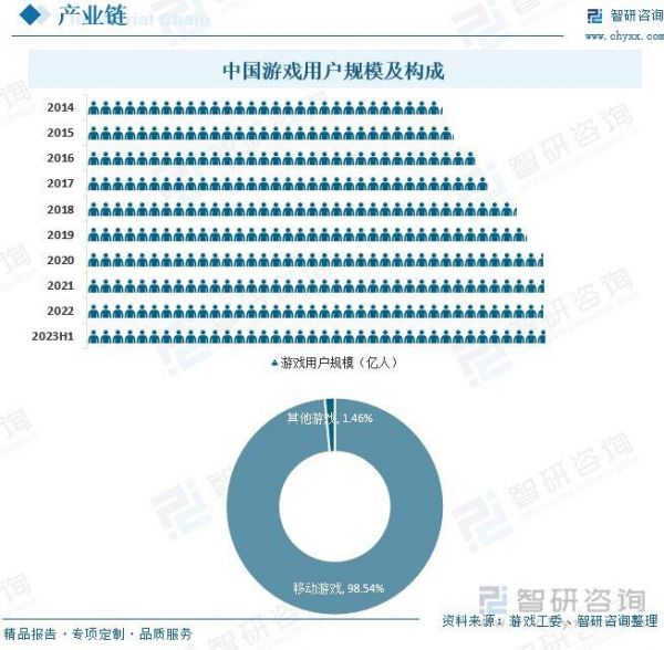 游戏产品直接面向个人消费者,近年来中国游戏用户规模快速增长,2021年中国游戏用户规模达6.66亿人,同比增长0.22%,2022年,中国游戏用户规模为6.64亿人,同比下降0.33%,继2021年用户规模增长放缓后,2022年用户规模也出现了近十年以来首次下降。下降的因素,则是由于新冠疫情影响以及缺乏新产品等原因,导致用户流失,中国的游戏用户规模正式进入了存量市场时代。2023年上半年中国游戏用户达6.68亿人,同比增长0.35%,随着用户规模的增加,为中国游戏产业发展来的广阔的增长空间。