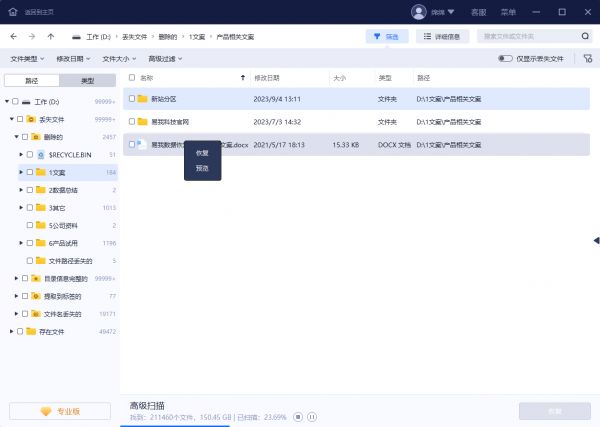 步骤2. 在扫描过程中或扫描完成后,您可以点击找到的文件/文件夹进行预览,删除的文件/文件夹通常在左侧「删除的」选项栏目下,同时可通过软件右上角「筛选」和「搜索」两个功能快速查找相关文件/文件夹。