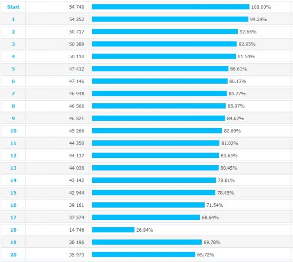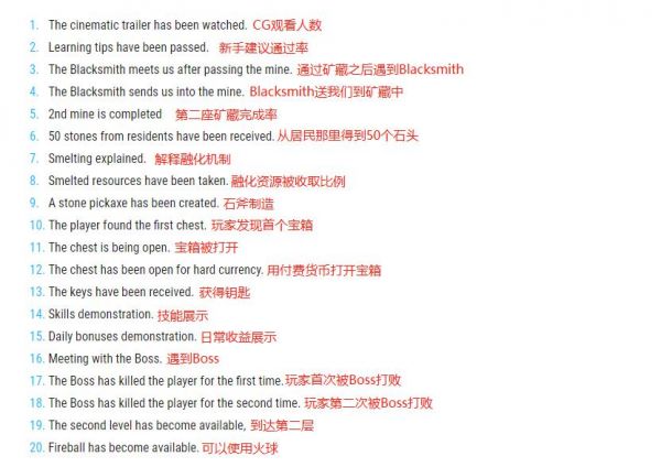第一列是新手教学的步骤,第二列和第三列分别代表达到这个阶段的玩家数以及占比,第四列则是玩家流失率。