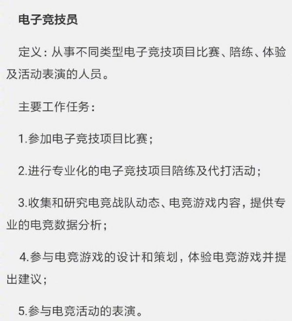 所以以后称呼电竞选手为职业电竞选手的说法,有些不正式啦。现在其正规的行业名称为电子竞技员(听起来没之前那么“职业”了,但是描述更加清晰准确)。电子竞技员的官方定义是:从事不同类型电子竞技竞技项目比赛,陪练,体验及活动表演的人员。