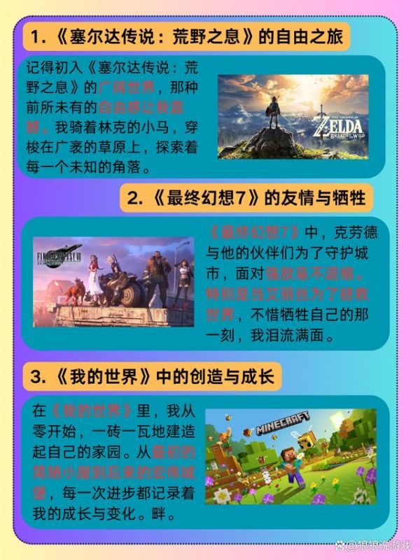 这些游戏经历与回忆,如同一串串珍珠,串联起我生命中那些闪耀的时刻。它们不仅让我享受到了游戏的乐趣,更让我学会了坚持、勇气、友情与成长。在未来的日子里,无论我走到哪里,这些美好的记忆都将是我最宝贵的财富,指引我前行。