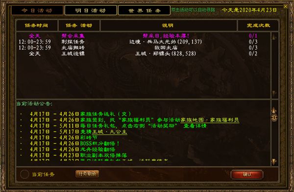 除此之外,每天还有一个特色的双倍经验任务,这个任务是每天都不同的,每周作为一个轮回。有些任务会比较繁琐,需要消耗的时间也比较多,这时候要学会取巧。例如采集任务,采集的速度可以通过额外伤害来辅助增加,例如在多宝阁中获得宝物,装备在玩家身上就可以增加额外伤害。如果有条件的朋友,一定要给自己配上一套移动装,这样做起“跑腿类”任务更加便捷。