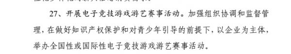 在通知表示,加强组织协调和监督管理,在做好知识产权保护和对青少年引导的前提下,以企业为主题,举办全国性或国际性电子竞技游戏游艺赛事活动。