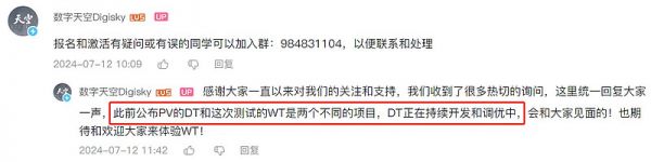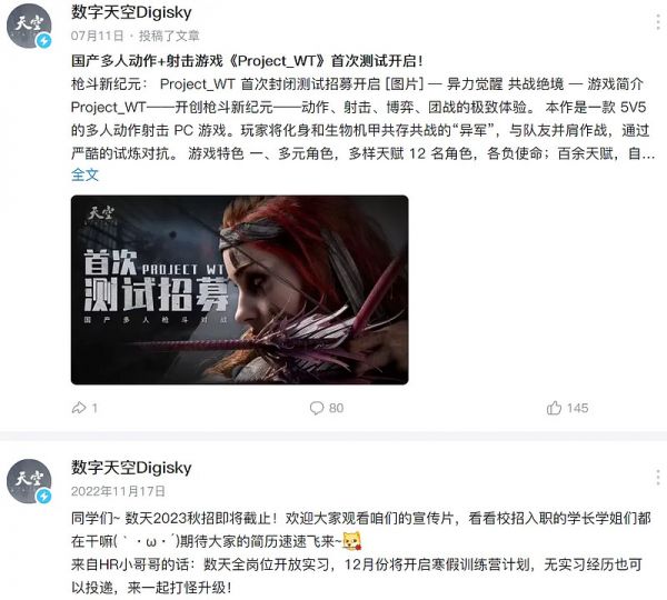 今年7月,数字天空曝光了旗下第二款3A游戏《Project WT》(以下简称《WT》)。事先也没有宣传,只是突然通过停更许久的官方账号发布了首次测试招募的信息。当时许多网友第一反应还以为是《Project DT》(以下简称《DT》)「复活了」——后者是公司自研的首款3A游戏,自2021年2月公布实机PV后再无消息,以至于网上多次传出「游戏没了」的谣言。