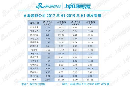 这7家企业分别是巨人网络、掌趣科技、完美世界、恺英网络(12.750, -0.33, -2.52%)、天神娱乐、冰川网络和吉比特,其中有4家相比于2018年上半年研发投入占营业收入比是上升的,天神娱乐略微持平,而吉比特和冰川网络则下降明显,其中吉比特从2018年上半年的16.84%下降至2019年的14.19%。