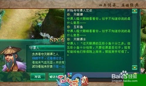 龙血树上的雕刻,这个也很简单——点击“龙血树”,然后点击“学习”就完成了。这个任务也是只能完成一次的,第二次点就会显示“这些雕刻对你已经没有帮助了”。天眼潭里的秘密,然后去打怪“海胆娃”,海胆娃会掉落五种不同颜色的海胆石。点击潭水,击杀鲛王获得道具“鲛王胆”。天眼潭这个谜题系统有两个作用,第一个,如果同时将5种不同颜色的海胆石扔进去,会有鲛王可以打。杀死鲛王可以获得“鲛王胆”。使用鲛王胆可以提升人物或者宠物1-5的甲子值。第二个,这里有天眼潭特产“五彩小鱼”。给NPC守潭老人赠送3条五彩小鱼可以获得一颗“万法丹”。每个玩家可以使用50颗初级丹药。