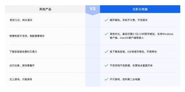 一、购买完成后进入云电脑,镜像内预装游戏,无需重新下载安装; 二、30s配置云电脑选择【电竞模式】,进入云电脑; 三、无需下载游戏,打开Steam/WeGame登录进入游戏。 PS: 关机不删存档不丢数据不计费,随心所欲玩!(暂不支持蓝牙手柄连接)
